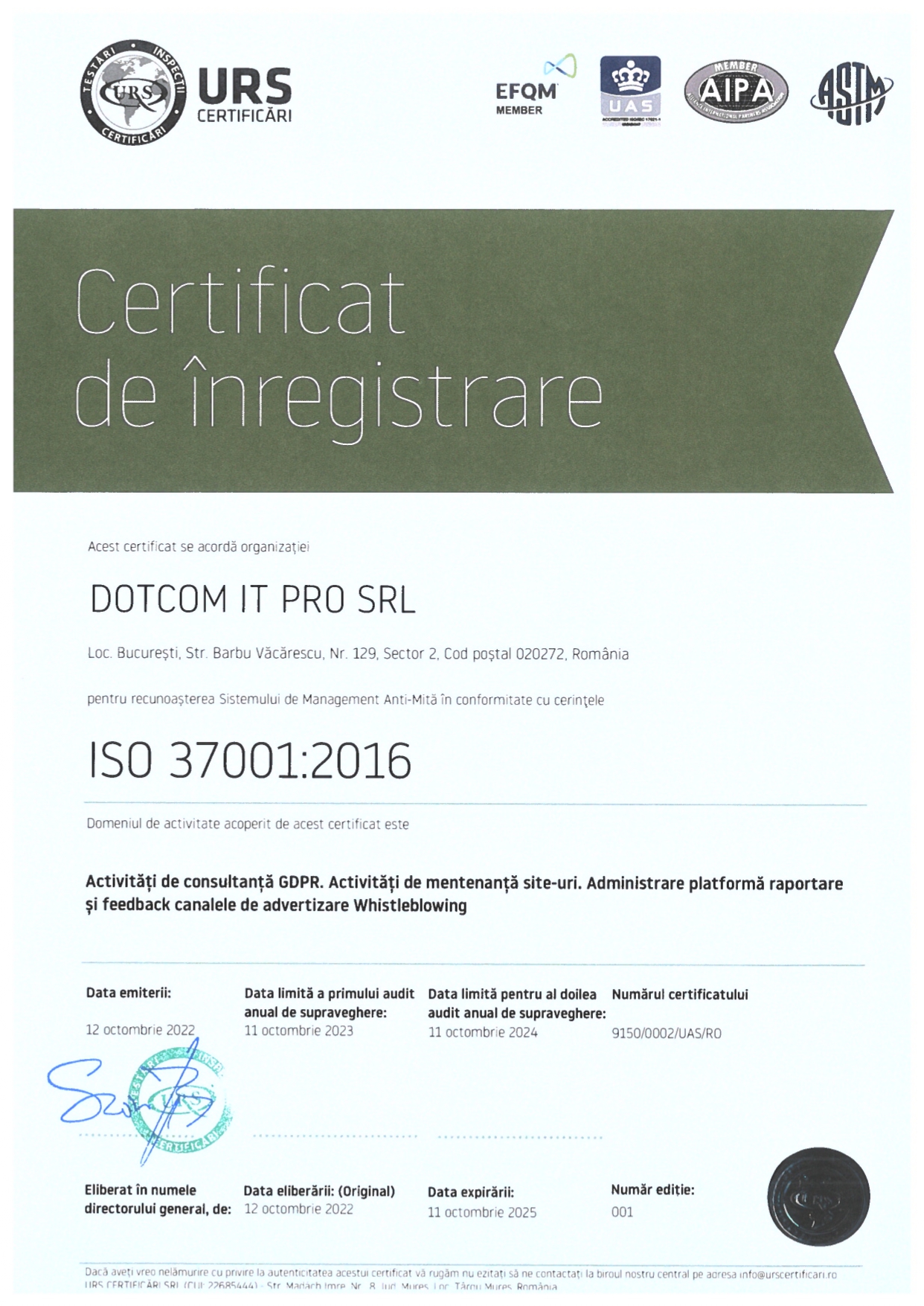 Certificare ISO 37001 pentru sistemul de management anti-mita.